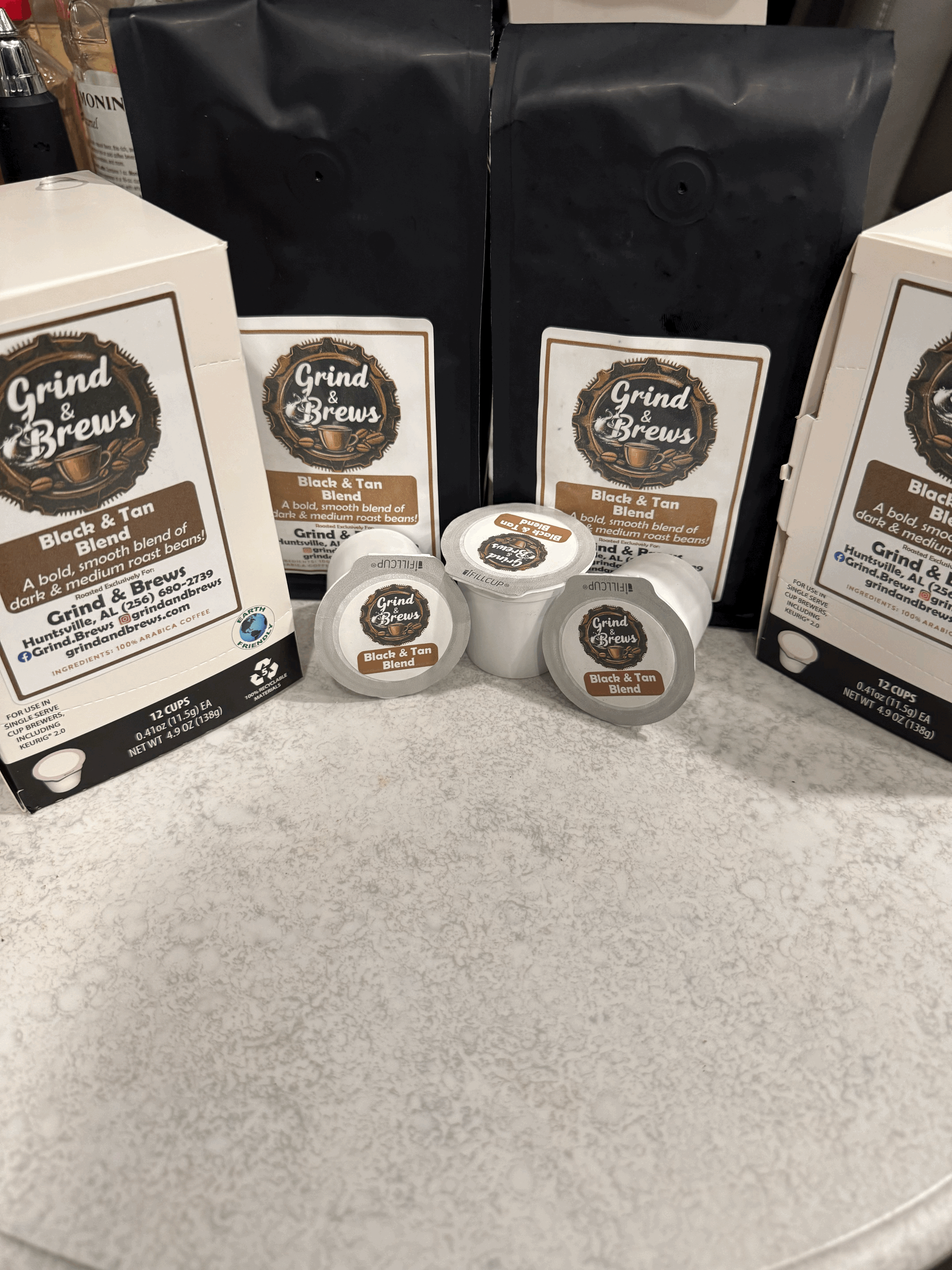 Black & Tan kcups $19.99 Grind & Brews Coffee Mug $16.99 Grind & Brews Logo Tees $24.99 Grind & Brews flex fit caps $29.99 Black & Tan $22.50 Wake Up America Blend $22.50 Grind & Brew Espresso $22.50